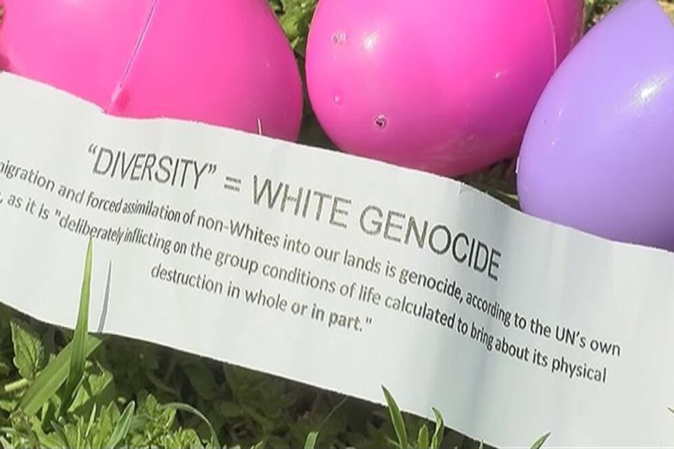 The message read "'Diversity' = White Genocide." The slip of paper further states immigration of "non whites" is genocide. Other eggs had links to two websites, depicting more controversial ideology.